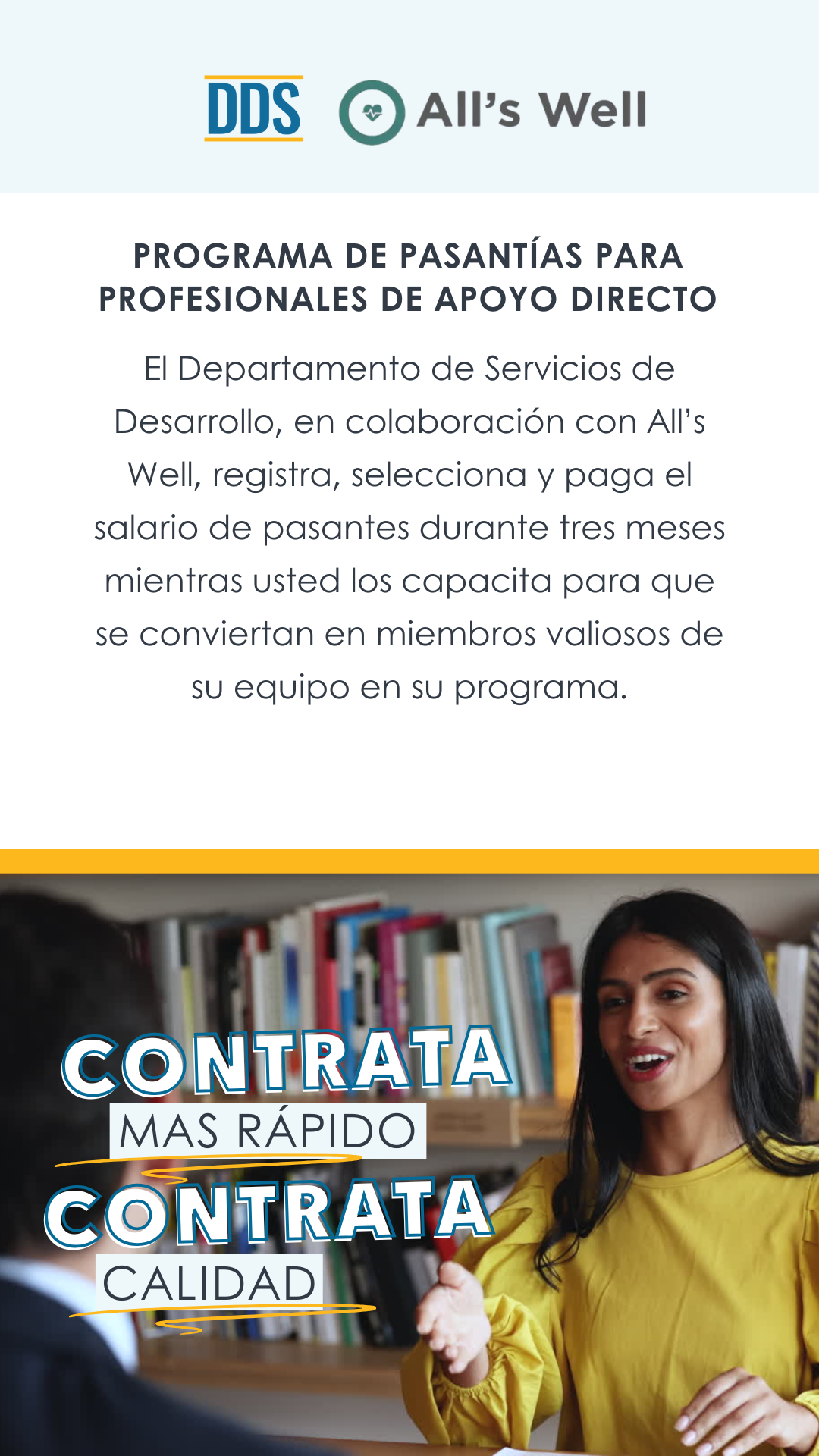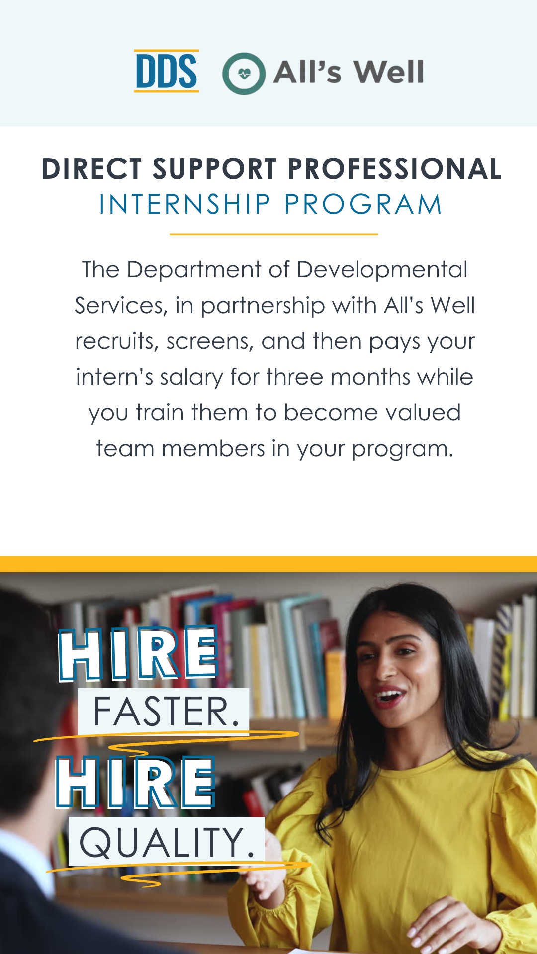 DDS’ contractor All’s Well recruits, screens, and then pays your intern’s salary for three months while you train them to become valued team members.